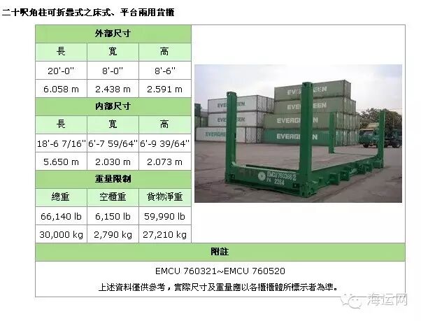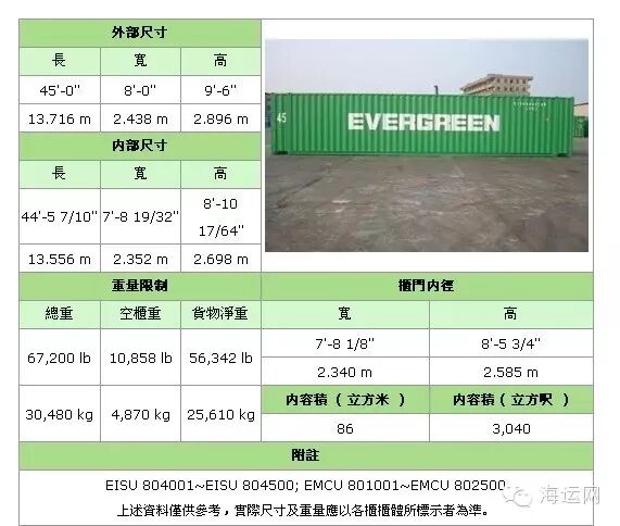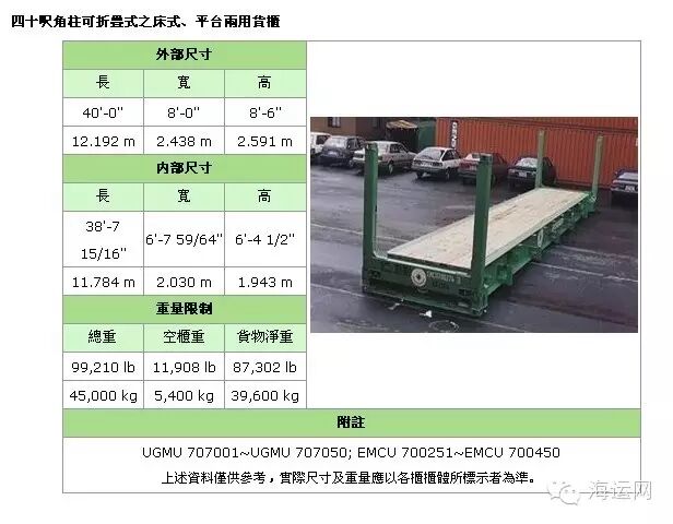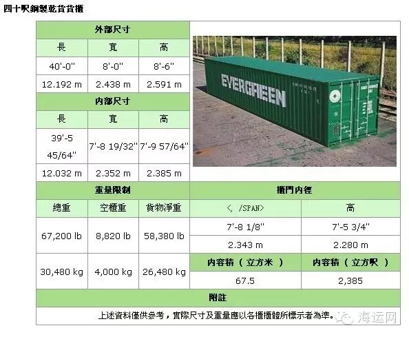 备注:集装箱适用于装载大型货物和重货,如钢铁、木材,机械,特别是像玻璃板等易碎的重