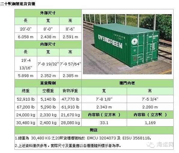 备注:集装箱适用于装载大型货物和重货,如钢铁、木材,机械,特别是像玻璃板等易碎的重货